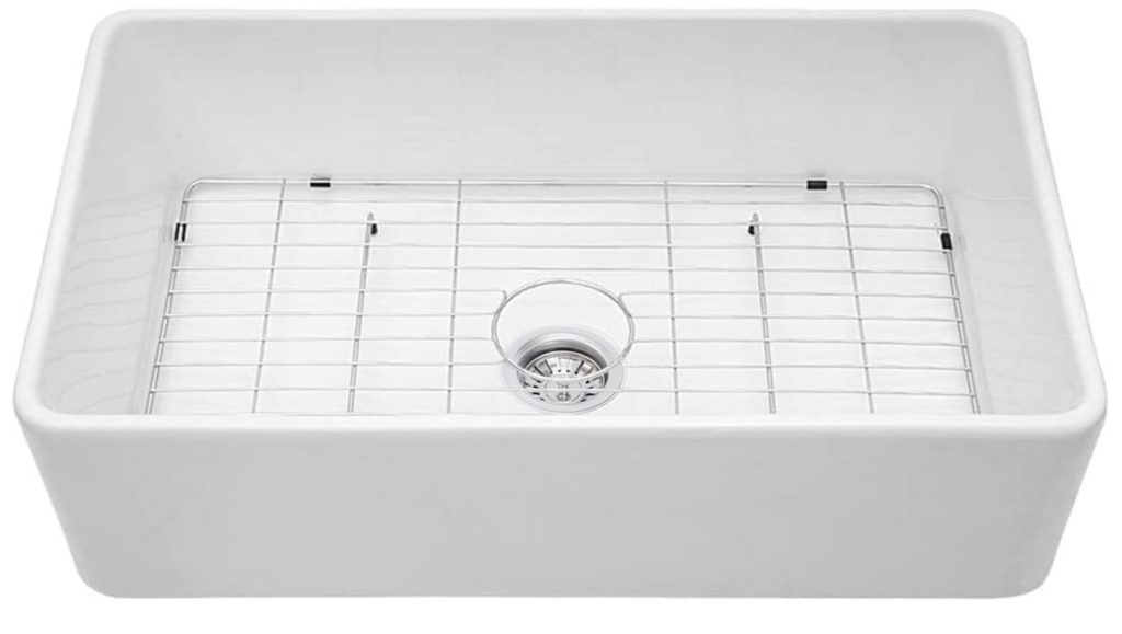 This sink is a close second. It’s also a beautiful white fireclay but more limited on sizes and options to choose from. However, it does include the strainer which can be helpful. It also has a little softer curve in the corners if that’s important to you.